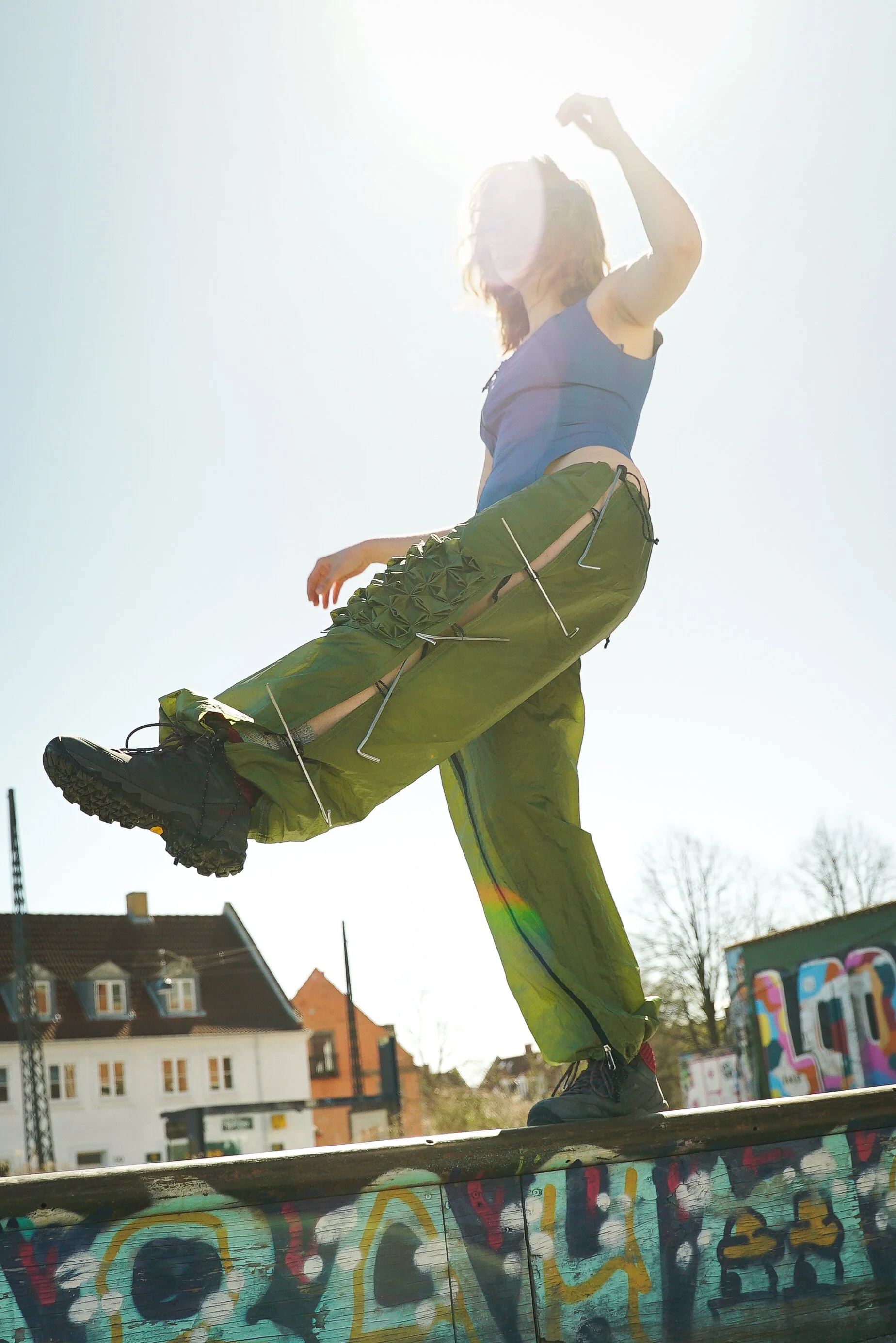 Bjørns mål var at lave et par bukser man kan klatre i, danse i og på alle andre måder bevæge sig i. Masser af funktionalitet og plads til opbevaring i bælterne.