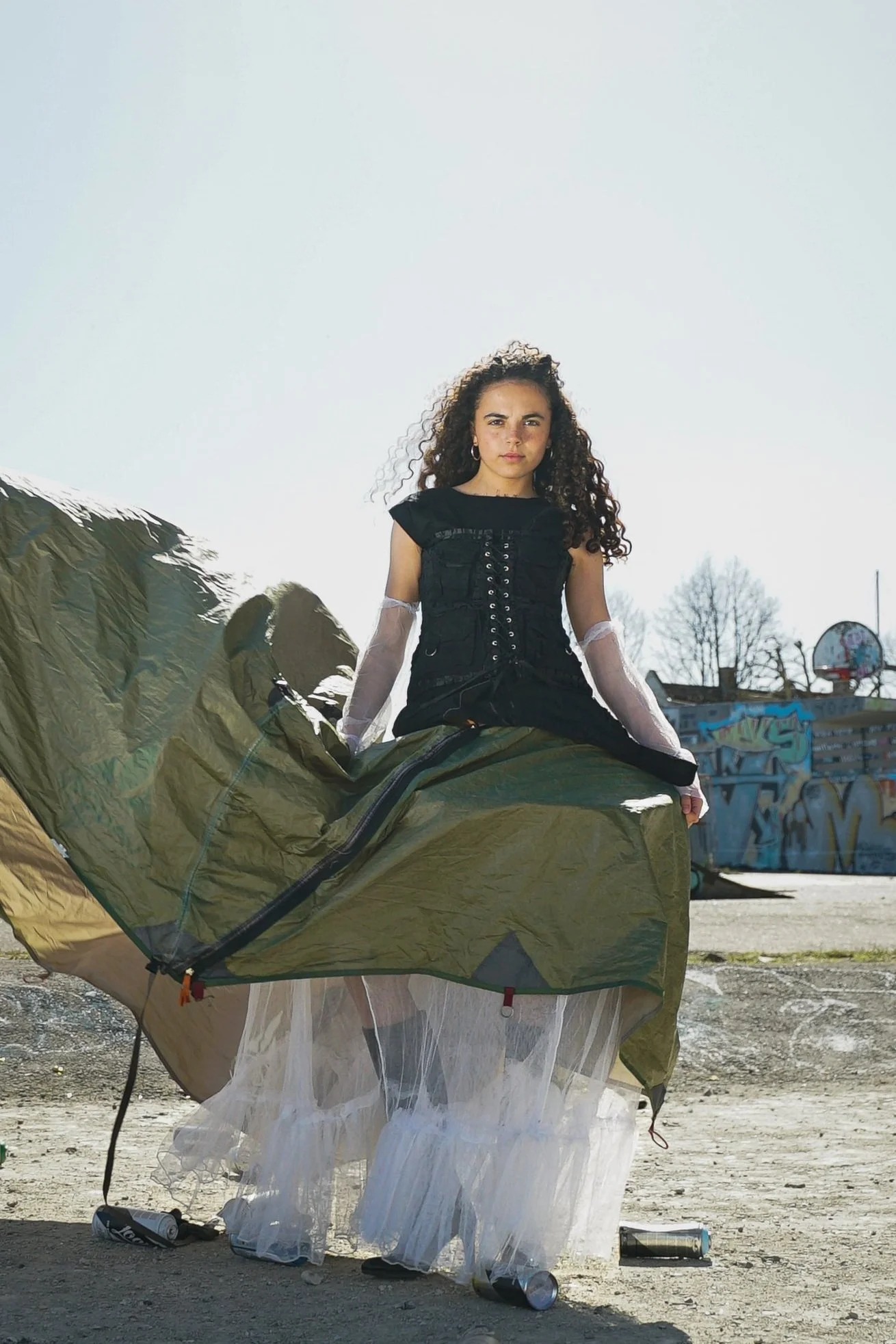 Julie har lavet en kjole af et telt og upcyclet en jakke, perfekt til en festlig camping tur.