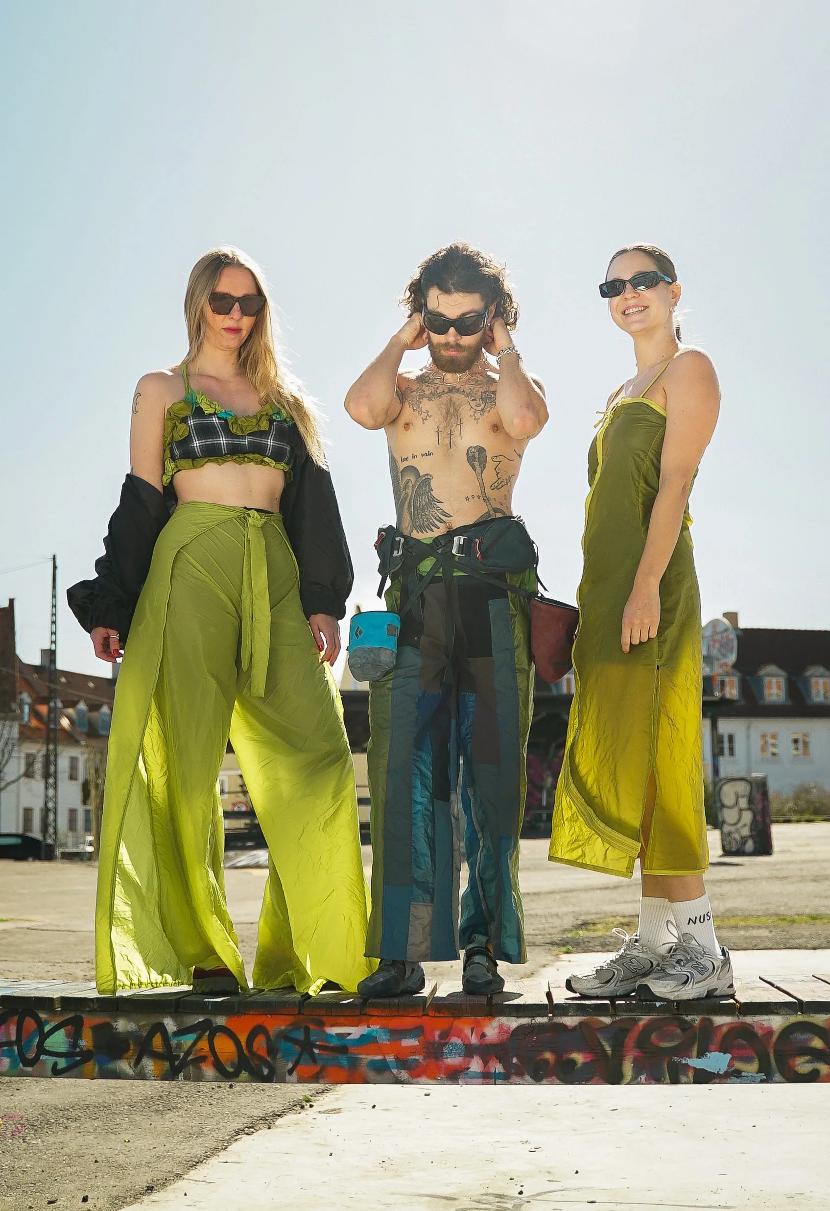 Marie, Josefine og Elisabeths outfit er inspireret af asiatisk kultur i stil af en upcyclet kimono. Derudover er både nederdel og taske lavet ud af gamle luftmadrasser.