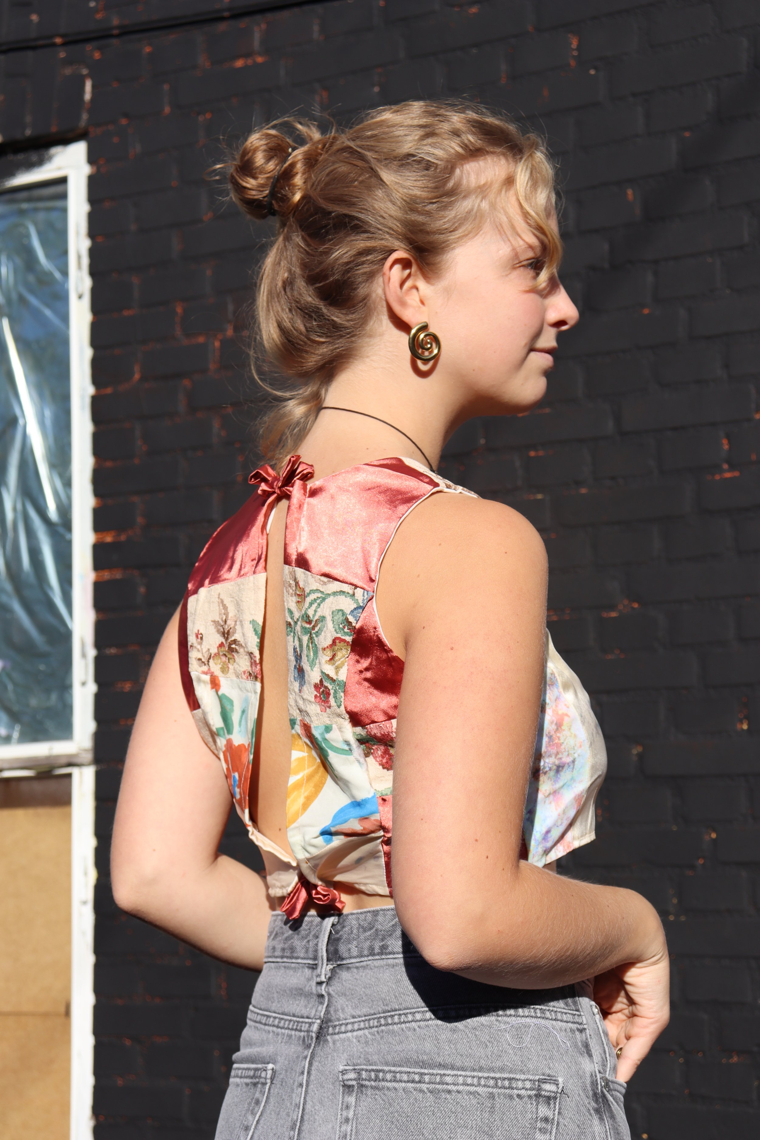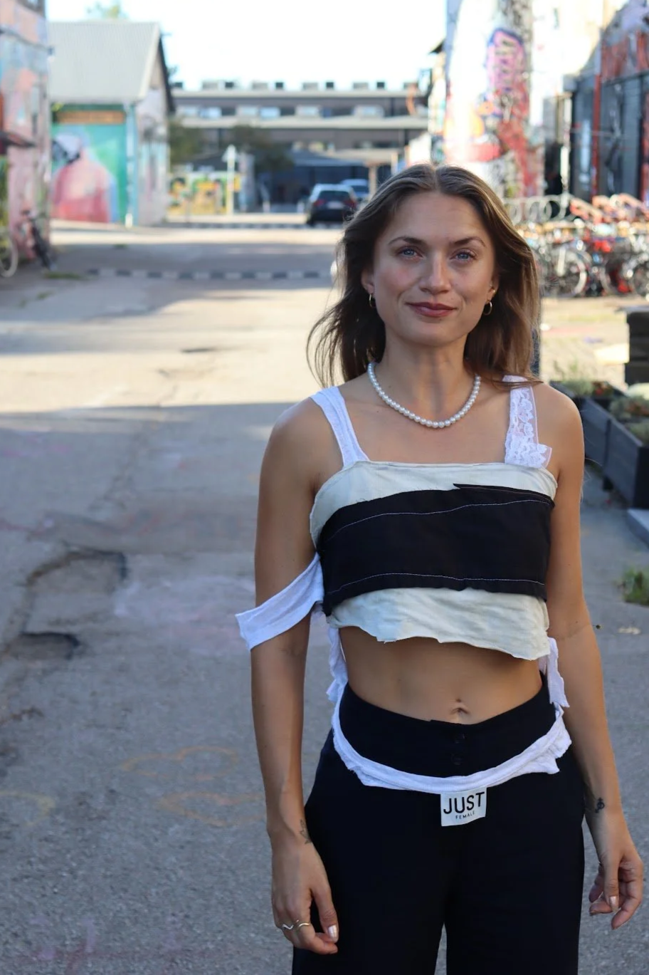 Claras design er skabt ud af en ambition om at bruge alt internt spild i hendes designvirksomhed. Toppen af lavet af det spild der opstår når hun bruger overlockeren - skraps som man ellers ville kassere.