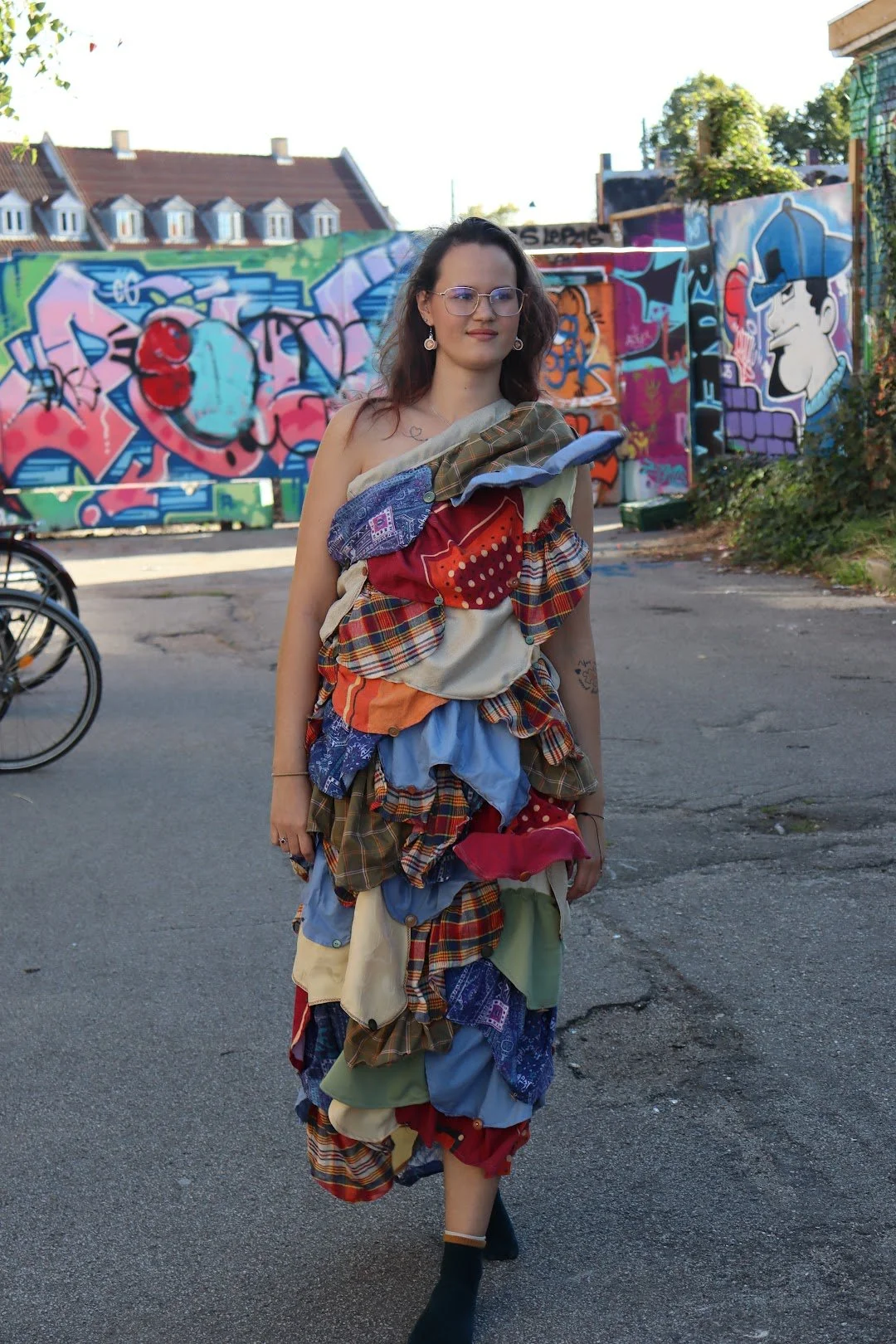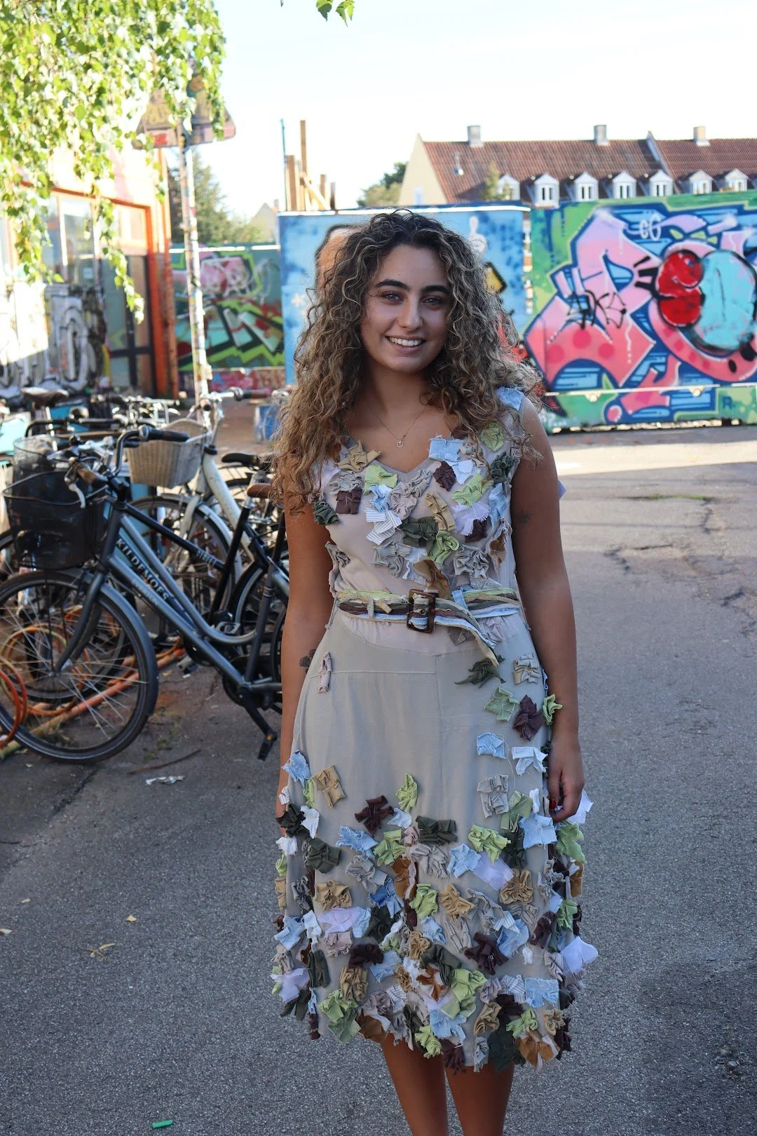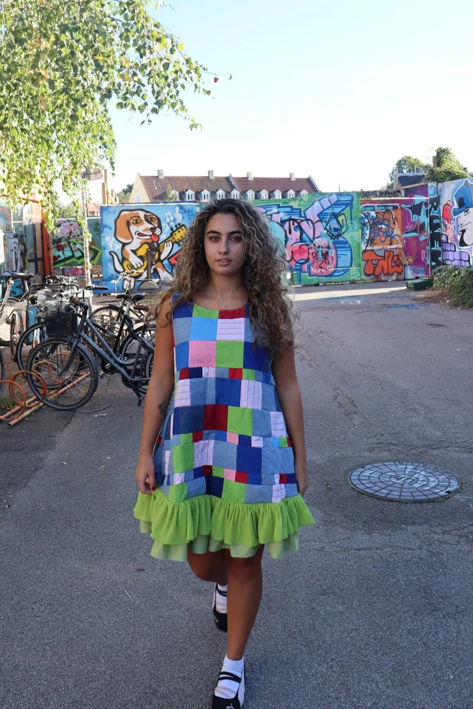 Mathildes outfit er inspireret af Syden med farver, kontraster og romantiske detaljer. Stort set alle hendes materialer er fundet på genbrugsstationen - så hvert stykkerne har en historie i sig selv.