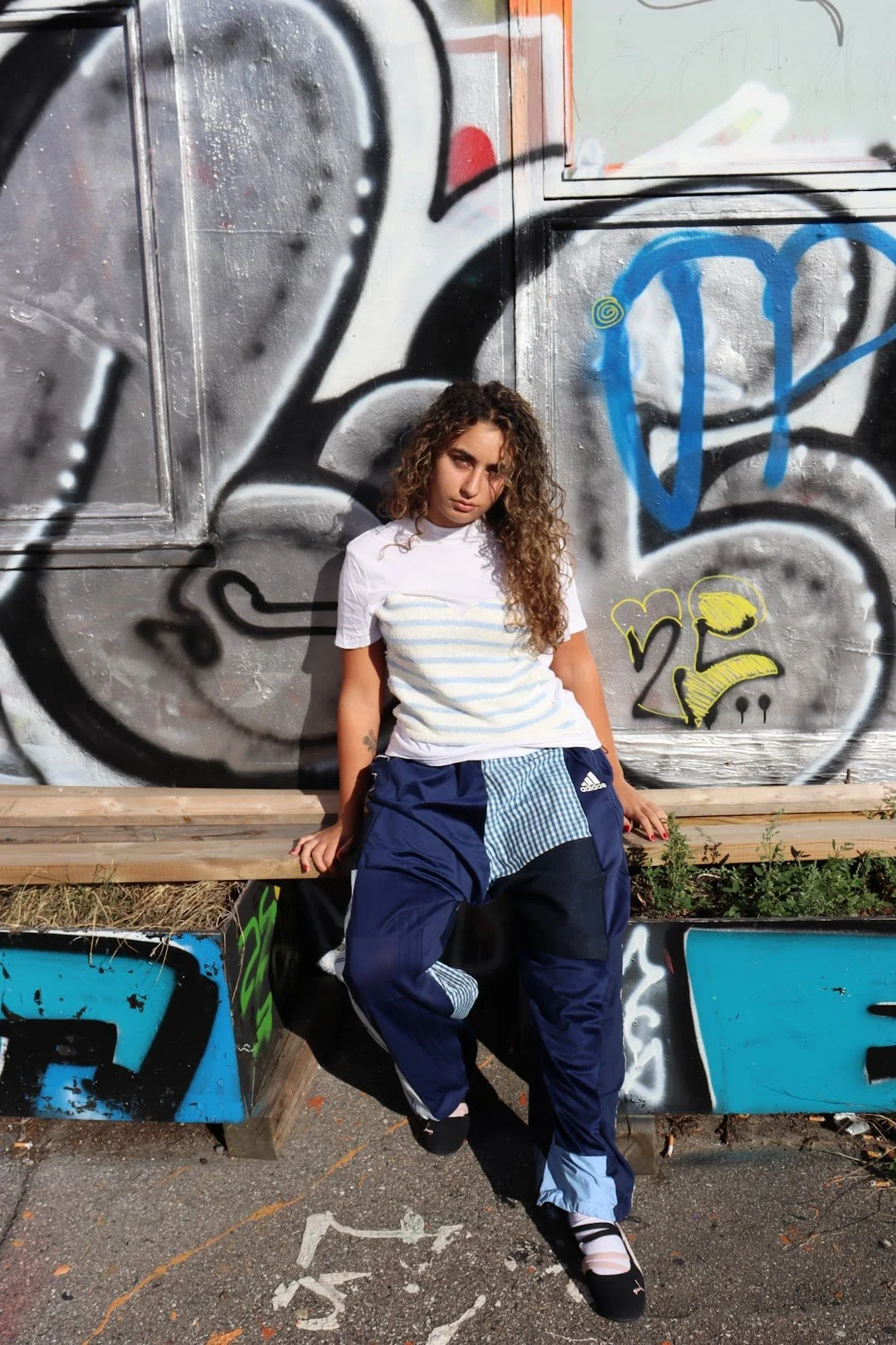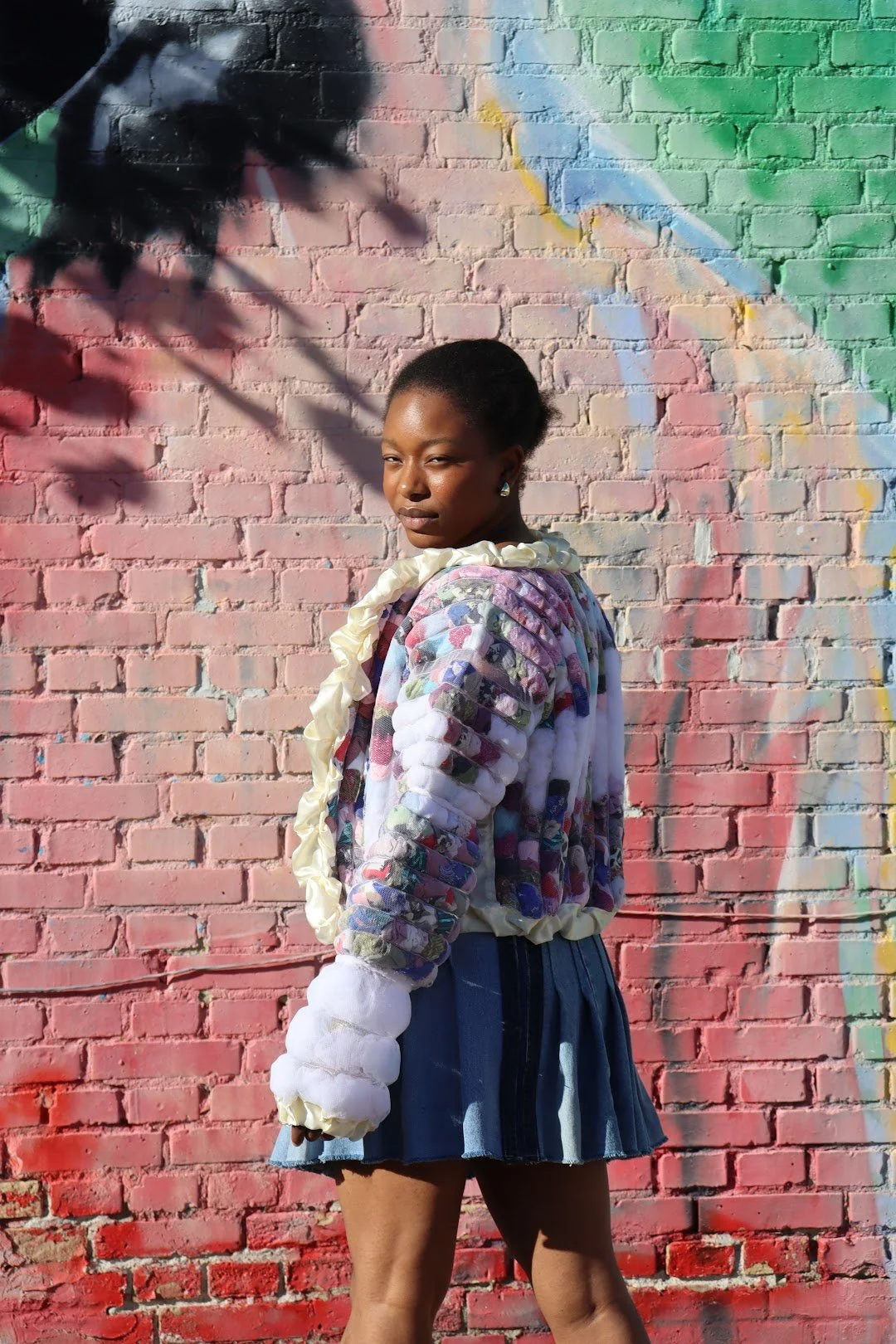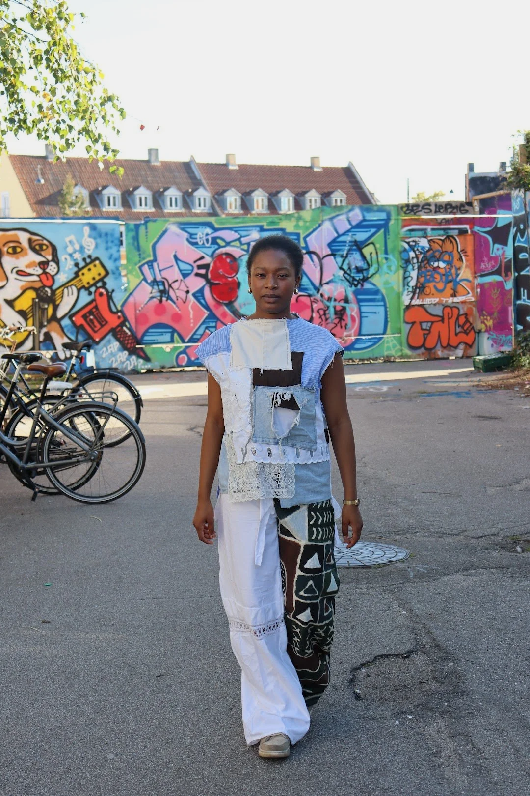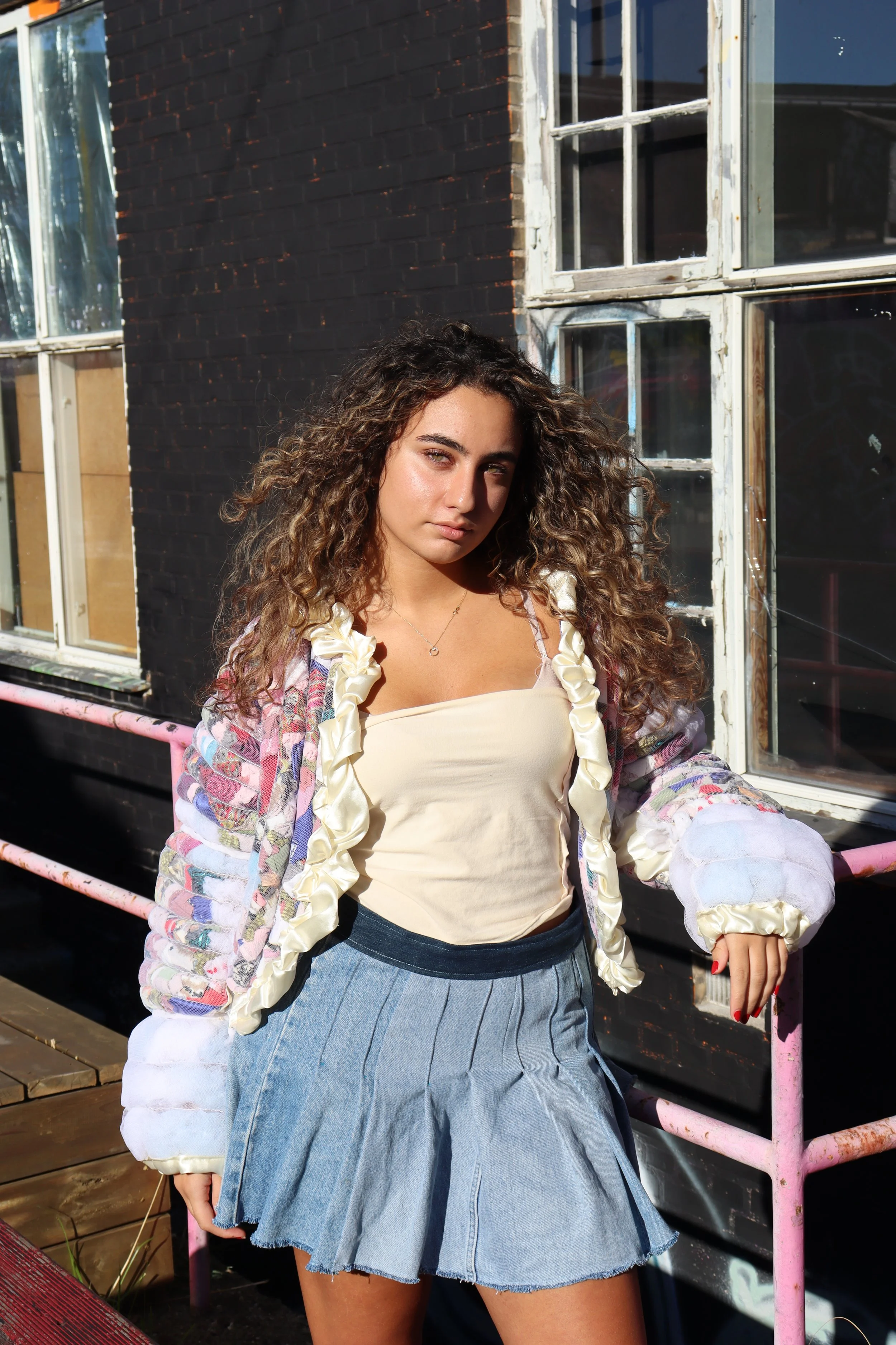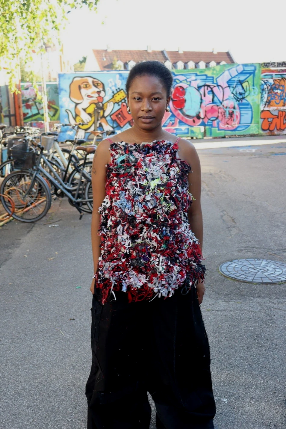 Julie have fokus på ikke at lave patchwork, men noget der var fluffy. ALT i outfittet er enten storskrald, loppefund eller arv. Denim bukseben fik endelig et nyt formål til en nederdel, efter at Julie har haft lavet mange bukser om til shorts i sommeren. -