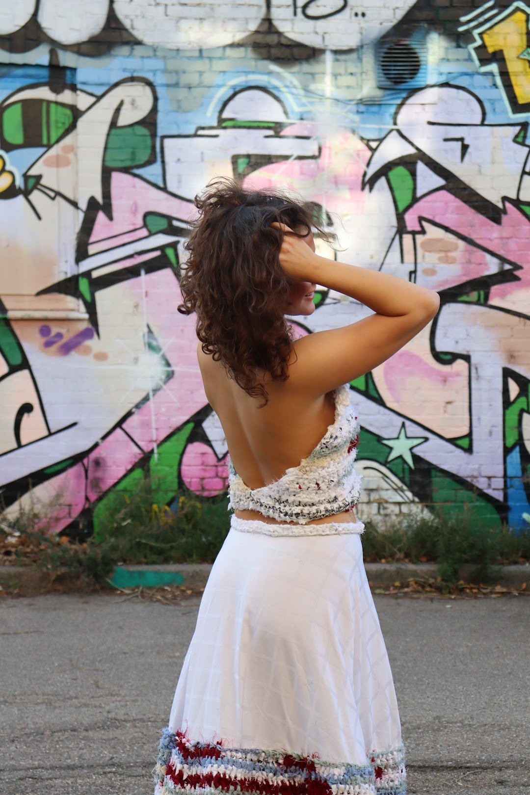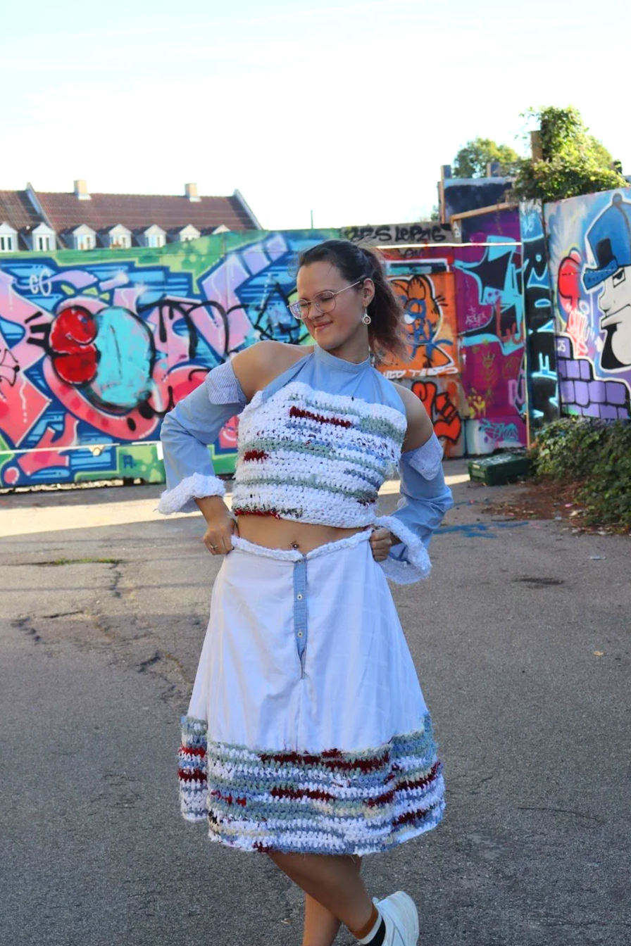 Alicja, som har kombineret hæklede elementer med store, farverige skørter til et ægte upcycled-prinsesse-outfit. Hovedparten af tøjet blev til i Ghana, mens hun rejste – hvor hækling kunne tages med!