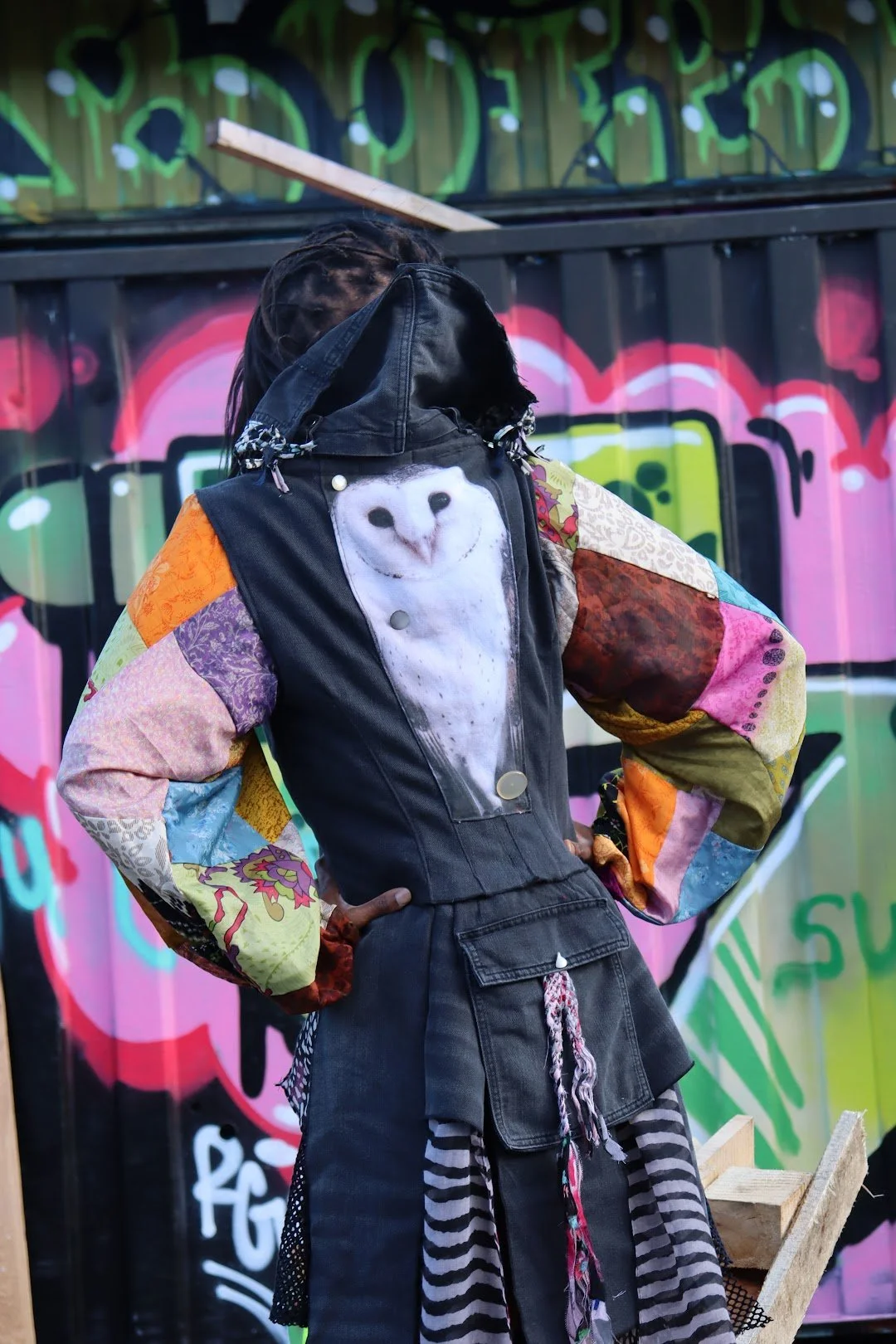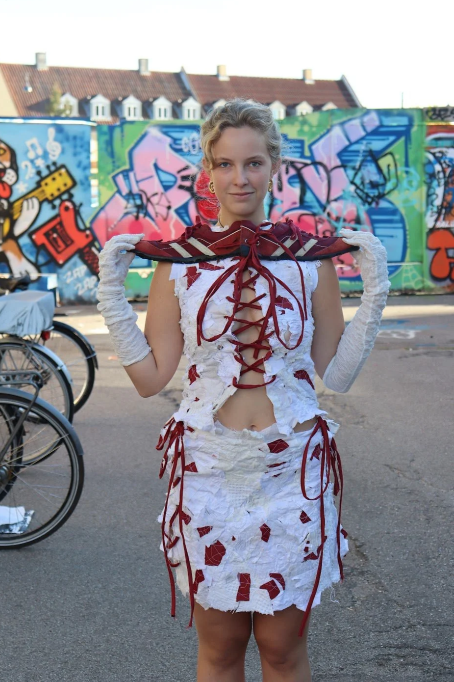 Emil startede med et par sko, hvor sålen smuldrede – og byggede hele sit outfit ud fra dem. Han har også brugt små scraps og vandopløseligt stof, og fik lavet dette look på kun to dage.