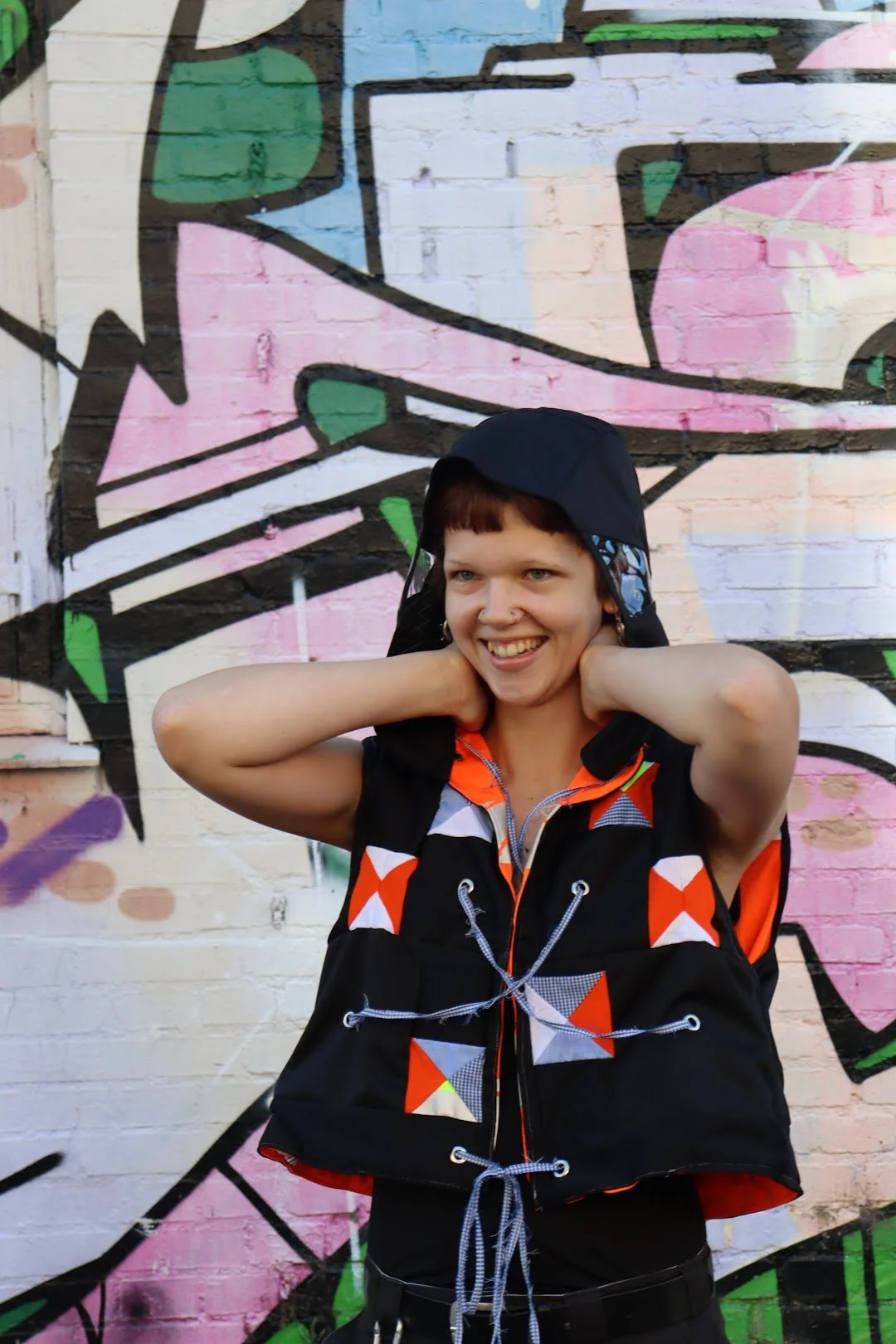 Karma har arbejdet med rester fra sin første Upcycling Challenge med STARK-arbejdstøj. Vesten er vendbar og er syet af meget små stykker stof og har dermed brugt en masse rester.