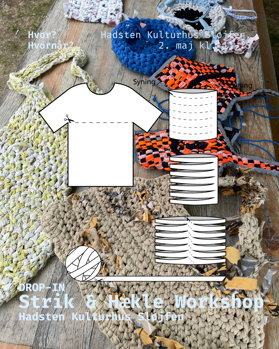 Til denne hyggelige drop-in workshop arbejder vi med genbrug og har kreativiteten i fokus. Du kan lære at lave dit eget tekstilgarn af f.eks. gamle t-shirts, stofrester eller andet tekstil – og bruge det til at strikke eller hækle små projekter med rester.